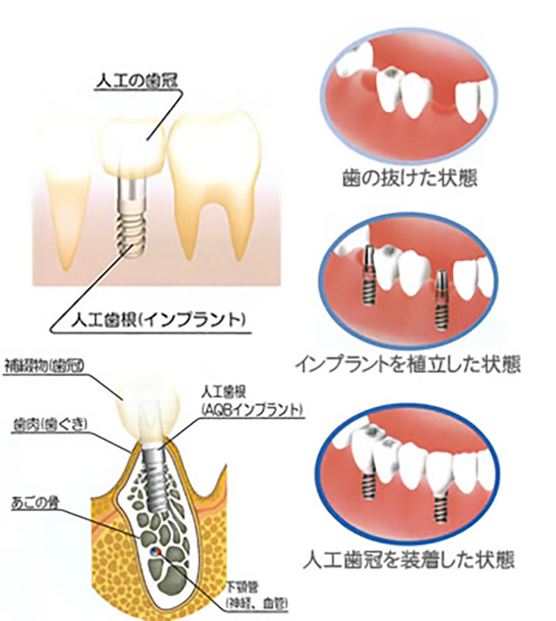 インプラントとは、歯が抜けたとき、抜けた歯の代わりに自然の歯に近い人工の歯を入れることをいいます。